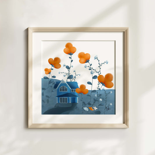 Blue house between flowers print
